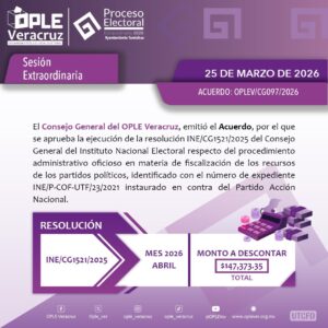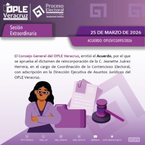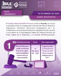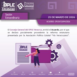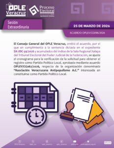 *Xalapa, Ver., 25 de marzo 2026.-* En el marco del cumplimiento de la sentencia SX-JDC-39/2026 emitida por la Sala Regional Xalapa del Tribunal Electoral del Poder Judicial de la Federación, en la que autorizó a la “Asociación Veracruzana Antipopulismo A.C.” celebrar su asamblea local constitutiva en fechas fuera del calendario programado, en sesión extraordinaria, el Consejo General del Organismo Público Local Electoral del Estado de Veracruz aprobó el ajuste del cronograma para la verificación de la solicitud para obtener el registro como Partido Político Local (PPL).